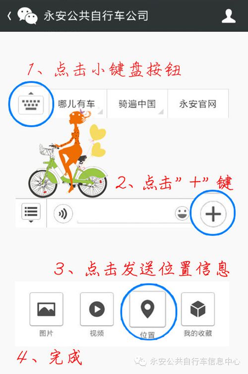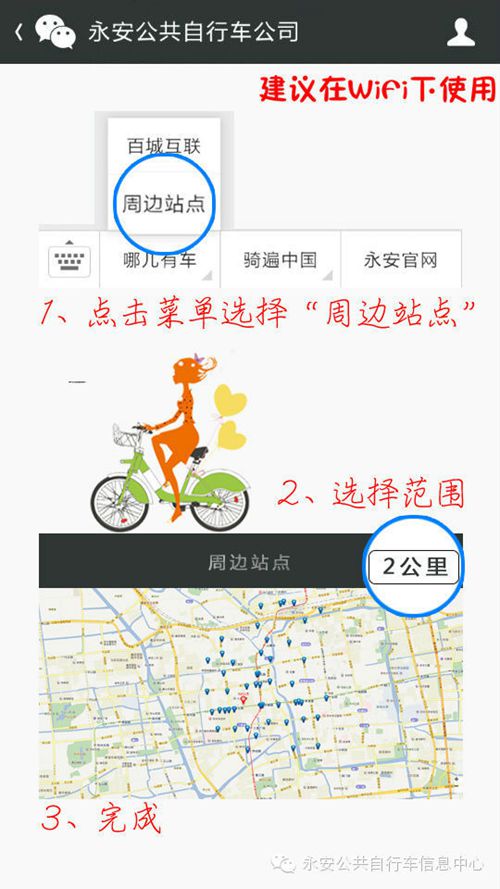 為方便廣大市民更好的使用公共自行車(chē),我司特推出永安公共自行車(chē)微信官方服務(wù)號,關(guān)注“永安公共自行車(chē)公司”或者“ibike668”,點(diǎn)擊“哪兒有車(chē)”,再點(diǎn)“周邊站點(diǎn)”,即能找出您附近所有公共自行車(chē)站點(diǎn)。