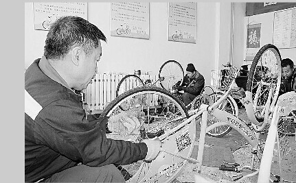 據維修人員介紹,為了確保自行車(chē)外形美觀(guān)和用戶(hù)騎行安全,2230輛自行車(chē)都將被全方位檢修一遍,并更換破損老化的零部件。維修人員對公共自行車(chē)重新拆裝、進(jìn)行大修。本報記者魏立波攝