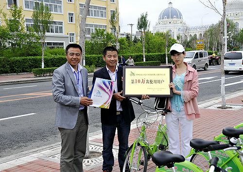 黑河市公共自行車(chē)服務(wù)中心領(lǐng)導為公共自行車(chē)第10萬(wàn)次使用用戶(hù)頒發(fā)榮譽(yù)證書(shū)、贈送禮品