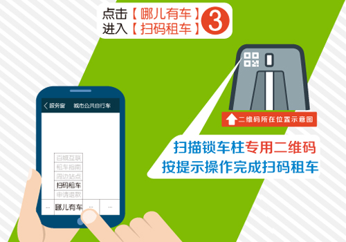 智能手機用戶(hù)點(diǎn)擊支付寶app,在“服務(wù)窗”內搜索添加【城市公共自行車(chē)】,并進(jìn)入【城市公共自行車(chē)】頁(yè)面;點(diǎn)擊“哪兒有車(chē)”中選擇“掃碼租車(chē)”;掃描鎖車(chē)柱上的掃碼租車(chē)專(zhuān)用二維碼,按提示操作即可輕松租車(chē),流程簡(jiǎn)單便捷。