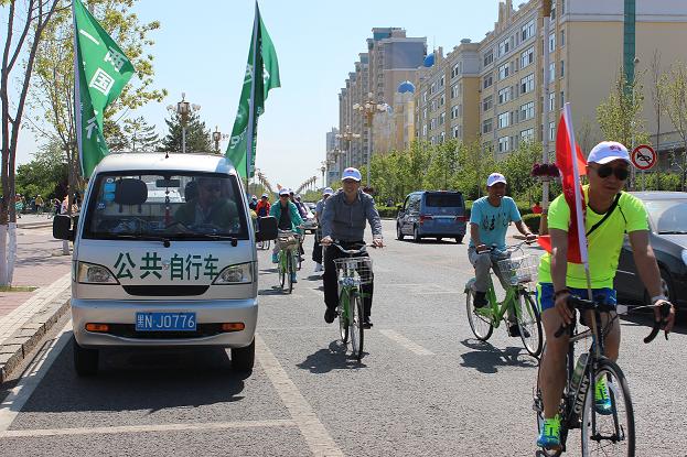 參加活動(dòng)的民建會(huì )員騎著(zhù)插有“兩國一城,一卡通行”、“綠色出行,低碳環(huán)?!睒苏Z(yǔ)的公共自行車(chē),從市區世紀廣場(chǎng)出發(fā),沿王肅街、郵政路、興安街、西興路、文化街、公園路、中央街、環(huán)城路一路騎行,宣傳綠色環(huán)保理念。