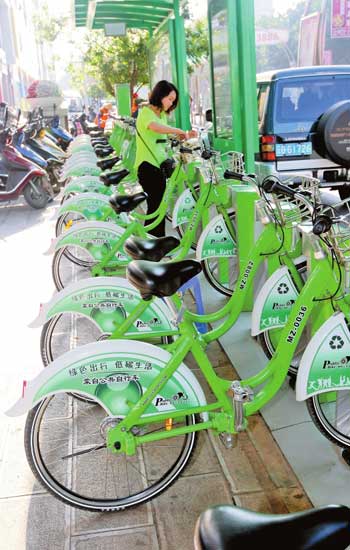 蒙自公共自行車(chē)系統推行兩年來(lái),使用率不斷提高,已成為方便市民出行的主要城市公共交通工具。2013年蒙自市政府投資870萬(wàn)元在主城區43個(gè)公共自行車(chē)站,投放了860輛自行車(chē);2014年又投資515萬(wàn)元開(kāi)展第二期擴容工程建設,站點(diǎn)新增加至74個(gè),投放自行車(chē)達1129輛,目前辦卡量近2萬(wàn)張,平均每天借還車(chē)數量近4000輛次。