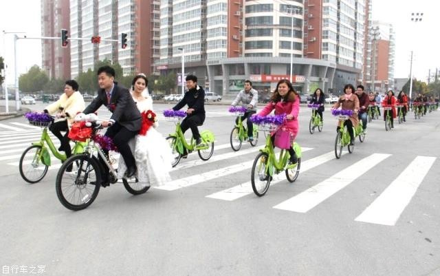 用公共自行車(chē)代替傳統婚車(chē),沒(méi)有豪車(chē),沒(méi)有奢華的場(chǎng)面,但親友團們組成的自行車(chē)陣,也賺足了市民的眼球,贏(yíng)得百分百的回頭率。在高檔婚車(chē)“熱”的當下,低碳、環(huán)保的公共自行車(chē)迎親隊伍猶如雨后一抹新綠,讓人眼前一亮。這種浪漫的結婚方式讓婚禮變得更有意義。