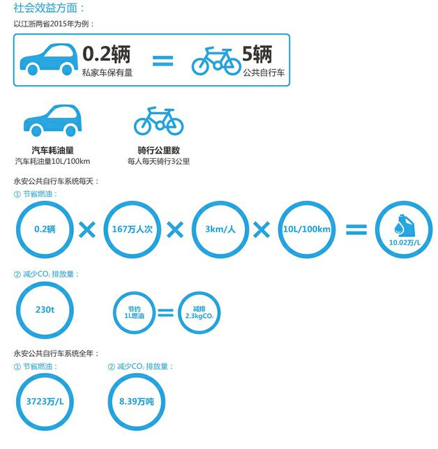 而從社會(huì )效益方面來(lái)看,江浙兩省2015年的人均私家汽車(chē)保有量為0.2輛;以每5人騎公共自行車(chē)代替1輛小汽車(chē)出行為例,按照每人每天騎行3公里;小汽車(chē)百公里10升耗油量計算,則永安公共自行車(chē)系統每天為全社會(huì )節省燃油10.02萬(wàn)升(0.2×167萬(wàn)人次×3公里/人次×10升/100公里),相當于每天減少二氧化碳排放230噸(節約1升燃油=減排2.3千克二氧化碳)。永安公共自行車(chē)系統全年為全社會(huì )節省燃油3723萬(wàn)升汽油,相當于減少8.39萬(wàn)噸的二氧化碳排放。