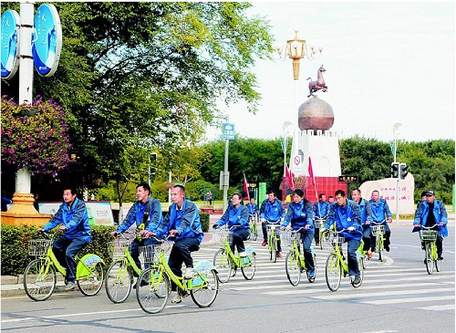 9月21日,黑河市公共自行車(chē)管理中心的工作人員環(huán)城騎行公共自行車(chē),打出“服務(wù)中國,引領(lǐng)低碳”的口號,呼吁大家放棄開(kāi)車(chē),駕駛新能源汽車(chē)、騎自行車(chē)或步行出行,紀念9月22日第19個(gè)“世界無(wú)車(chē)日”。