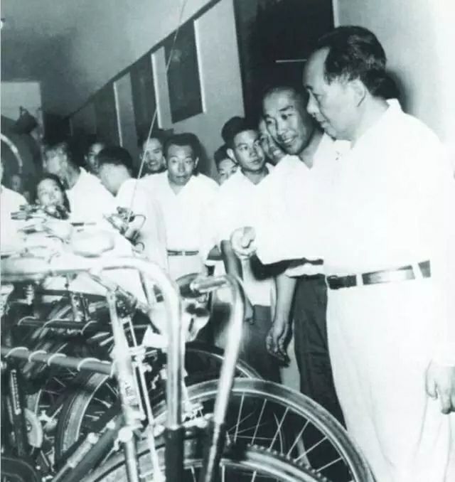 1958年8月毛澤東主席參觀(guān)飛鴿牌自行車(chē)。