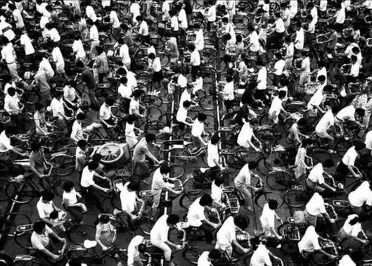 1981年,北京。北京市民騎著(zhù)黑色或灰色的自行車(chē)趕去上班。當時(shí)每三個(gè)人中,只有一人能幸運地擁有一輛自行車(chē)。