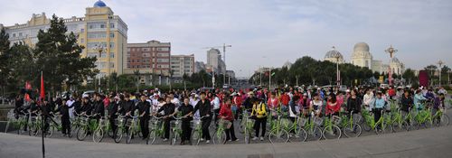 8月25日早6:30分,在黑河市世紀廣場(chǎng)由市婦聯(lián)、市體育局、市執法局聯(lián)合主辦的關(guān)于“倡導低碳環(huán)保,巾幗綠色騎行”活動(dòng)。參加活動(dòng)的人員是由黑河市各大局、機關(guān)、事業(yè)單位的近200名婦女同志組成的環(huán)城騎行隊伍。